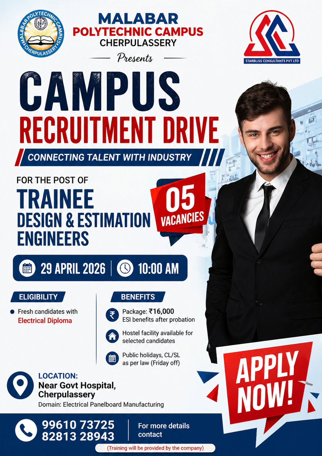Malabar Polytechnic Campus, Cherpulassery, in collaboration with Starbliss Consultants Pvt Ltd, is organizing a recruitment drive for the post of Trainee Design & Estimation Engineers.